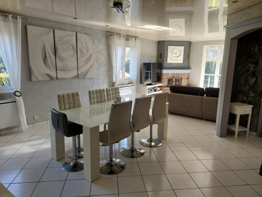 Cette villa se compose d'une cuisine équipée ouverte sur un spacieux salon séjour de plus de 40m² avec cheminée, belle baie vitrée et son accès balcon. Dans son prolongement une grande terrasse carrelée, ouvrant sur son magnifique jardin
